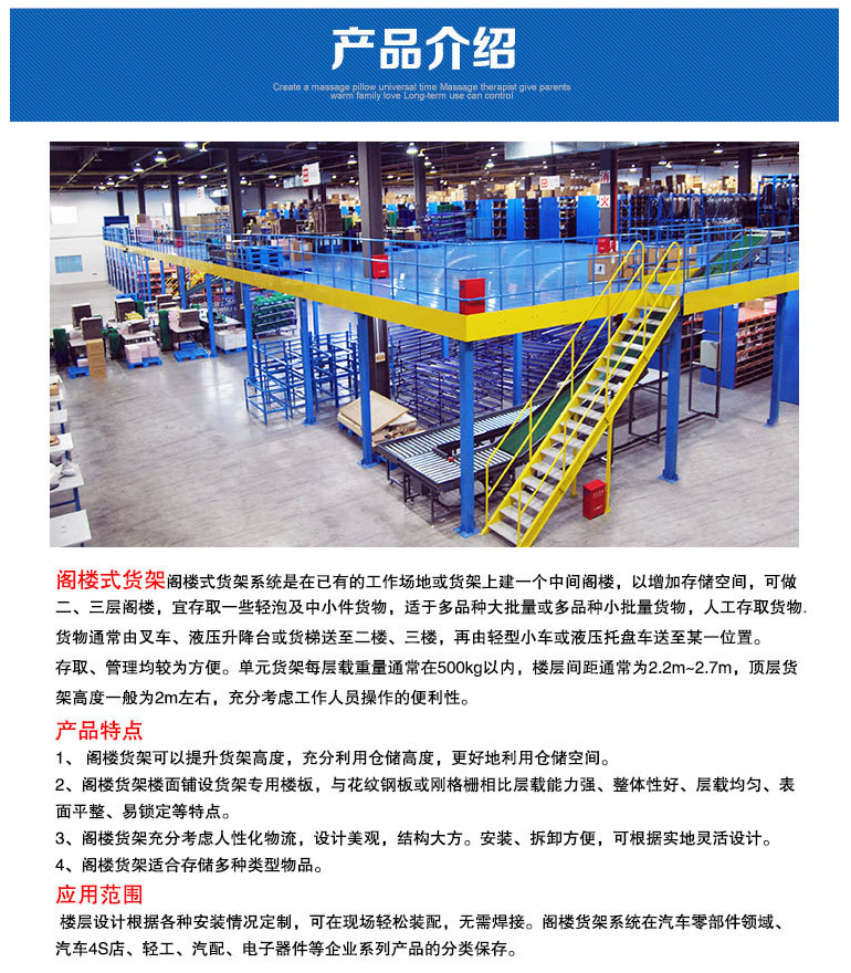 3、阁楼货架充分考虑人性化物流,设计美观,结构大方。安装、拆卸方便,可根据实地灵活设计。