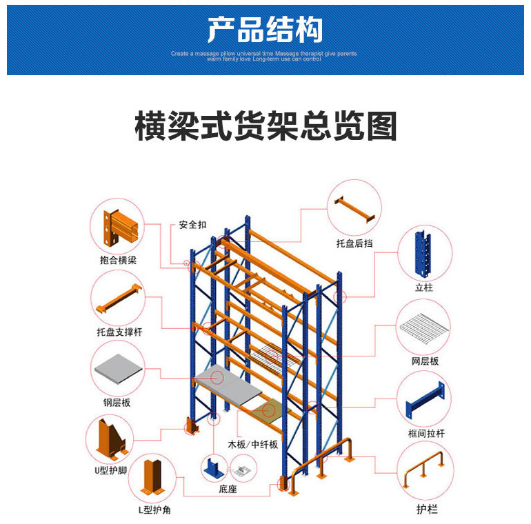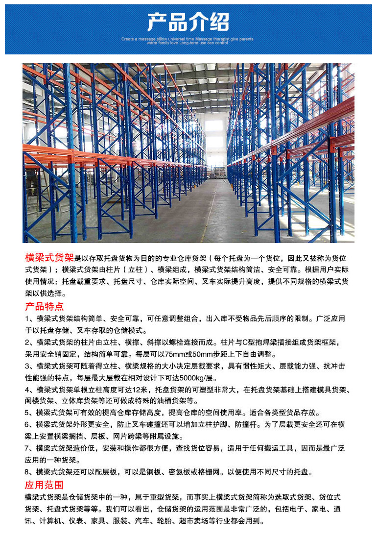 重型货架,又俗称横梁式货架,或称货位式货架,属于托盘货架类,在国内的各种仓储货架系统中较为常见一种货架形式。以立柱片+横梁形式的全组装结构,结构简明有效。可根据存储单元集装设备的特性加装如:隔档、钢层板(木层板)、金属丝网层、仓储笼导轨、油桶架等功能性附件。满足不同单元集装设备形式的货物存储。