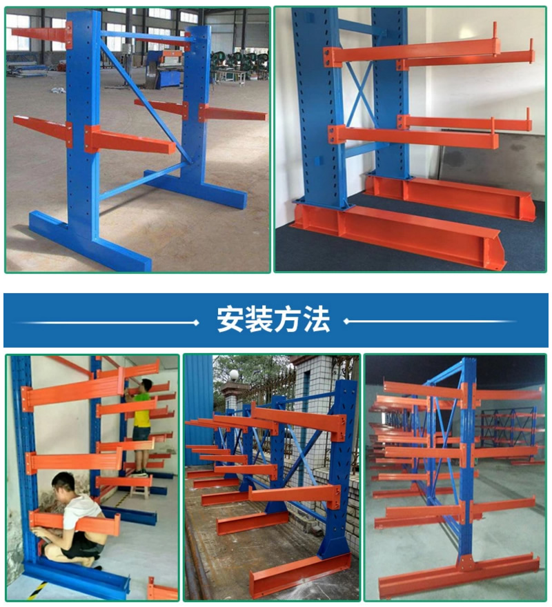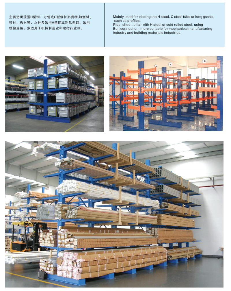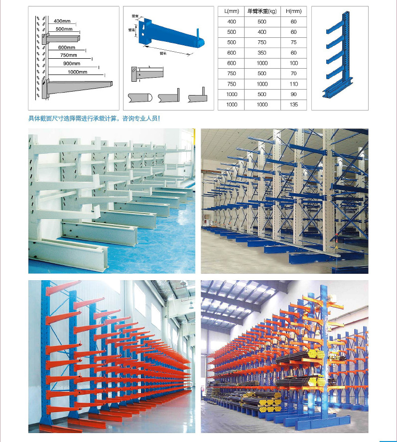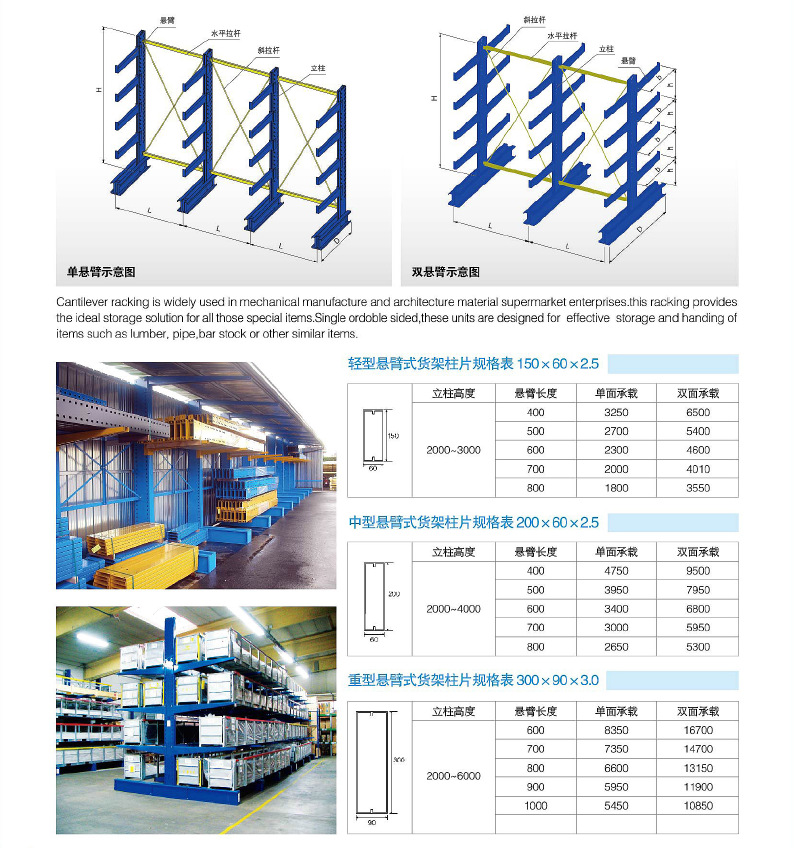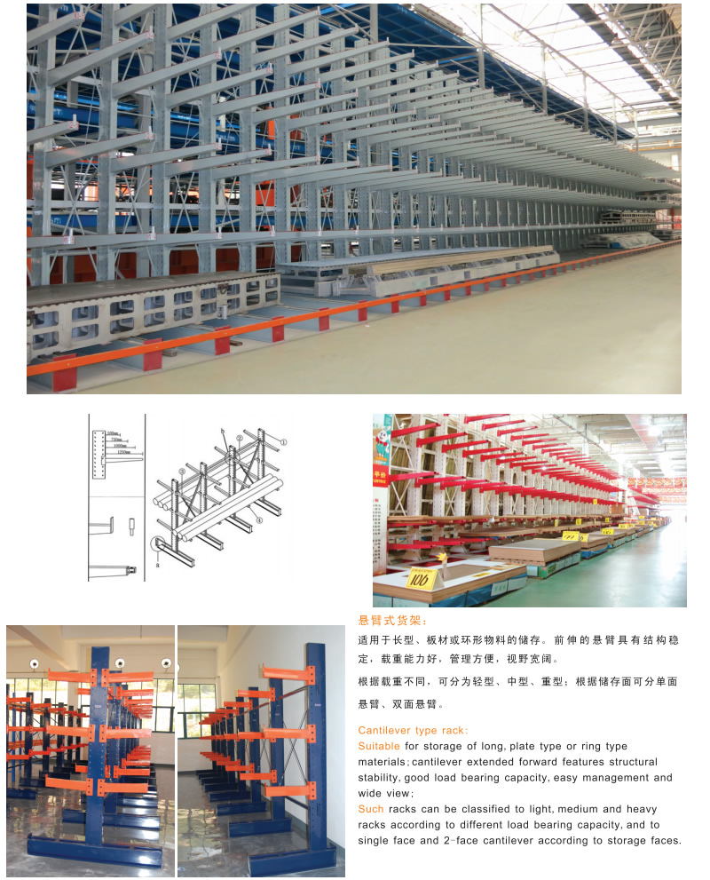产品介绍: 悬臂式货架适用于存放长物料、环形物料、板材、管材、及不规则货物。悬臂可以是单面或双面,悬臂式货架具有结构稳定,载重能力好、空间利用率高等特点。悬臂式货架立柱采用H型钢或冷轧型钢,悬臂采用方管、冷轧型钢或H型钢,悬臂与立柱间采用插接式或螺栓连接式,底座与立柱间采用螺栓连接式,底座采用冷轧型刚或H型钢。